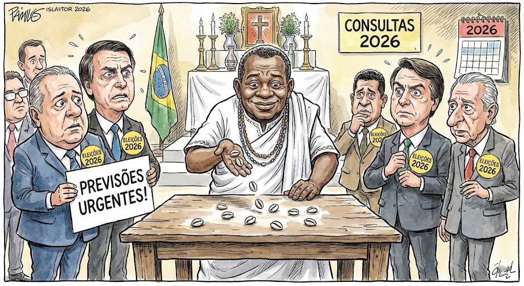 Como acontece todo ano, fui consultar o Pai João para saber as previsões políticas para 2026. Não foi fácil convencer o pai de santo a jogar os búzios para os nossos políticos. Ele diz que a classe política palhocense é tão previsível que, se fosse depender deles, morreria de fome. Assim como nossos políticos, com o “bruxo” não é diferente. Também foi toma lá, dá cá! Pra bem dele fazer as previsões para 2026, exigiu que o ajudasse a desengavetar um projeto de lei que está na Câmara e que doa ao terreiro do Pai João uma área na laje de um prédio de 20 andares no Pagani! Outra reivindicação do Pai João foi para que eu falasse com algum vereador para que dê entrada na Câmara a uma Moção de Parabenização para o Papai Noel. Ele também quer que a Prefeitura reserve algumas esquinas da cidade para que possam depositar seus trabalhos!
