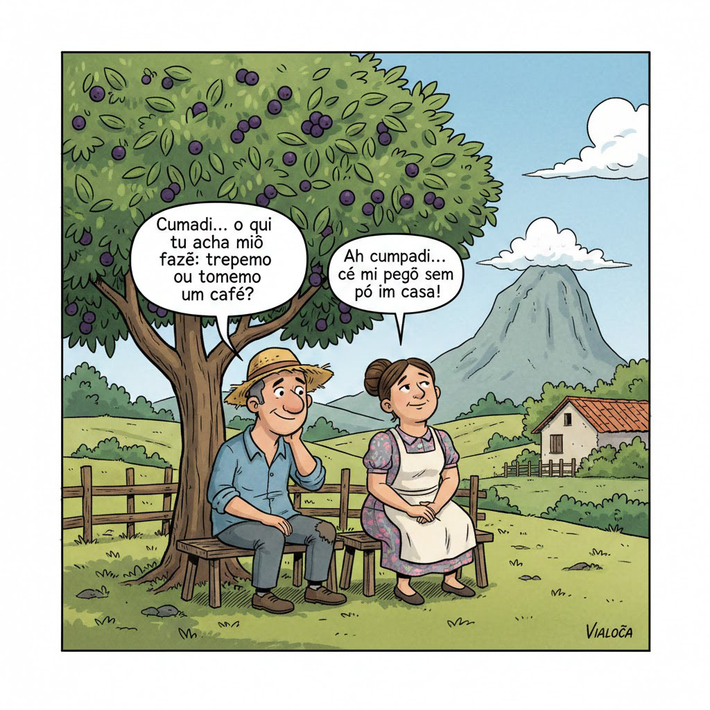 O Vilson, há muito tempo estava de olho na “cumadi”. Um dia, aproveitando a ausência do “cumpadi”, resolveu fazer uma visitinha para ver se ela não carecia de alguma coisa. Chegando lá, os dois, meio sem jeito, não estavam acostumados a ficar a sós. Conversavam debaixo de um pé de jabuticaba. Sem muito assunto, falaram sobre o tempo: