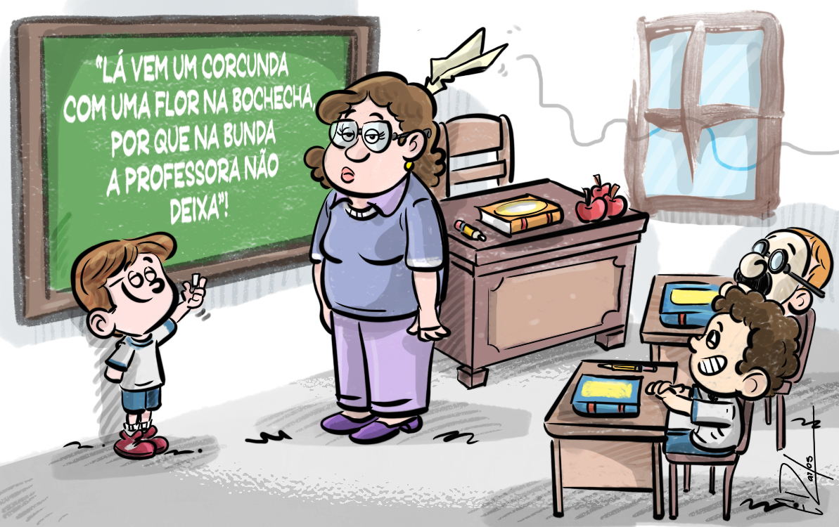 - Tá bem, fessora, é pra já: "Lá vem um corcunda / com uma flor na bochecha / porque na bunda / a professora não deixa".