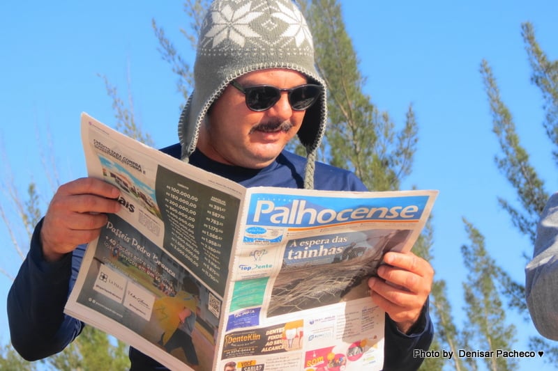 Pescador da Praia do Sonho, esperando a bendita tainha, com um olho no mar e outro no jornal Palhocense, para ficar por dentro das notícias da cidade.