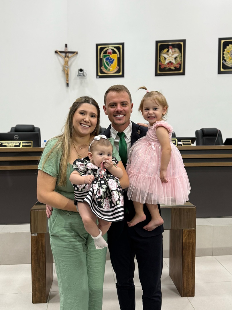 Assumiu uma cadeira na Câmara Municipal o suplente de vereador Ney da Padaria, que, na foto, está com sua esposa, Ariany, e as filhas Bella e Betina. Ney assumiu no lugar do vereador Juninho da Farmácia, que agora é secretário municipal. Ney disse, ao tomar posse como vereador: “Para mim, foi a realização de um sonho que foi sonhado por 1.308 cidadãos de Palhoça”. Ele promete ser um vereador atuante e que vai cumprir com empenho seu mandato, respeitando e honrando cada voto de confiança.