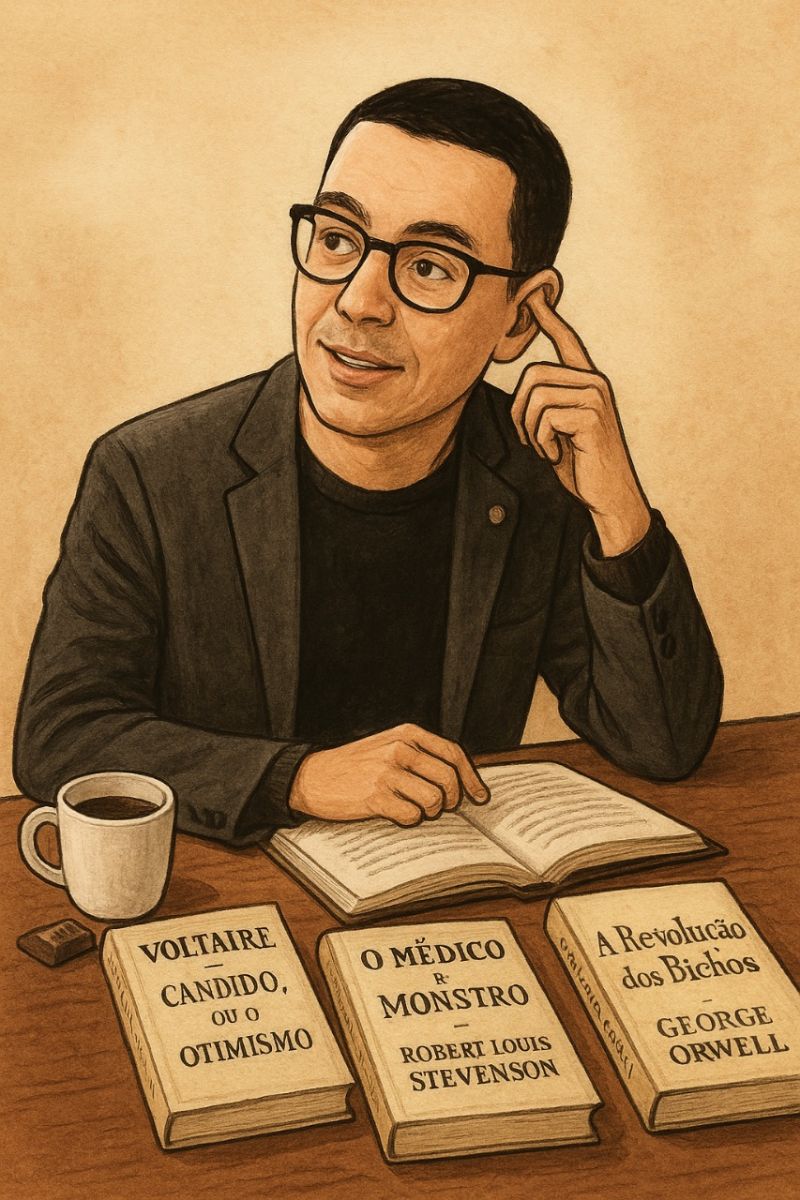 O ano letivo se arrasta para o fim, mas meu hiperfoco insiste em me negar descanso. Estou na sala dos professores, esse espaço onde o silêncio é tão raro quanto uma tarde sem burocracia. Sobre a mesa, espalho alguns livros que pretendo usar no próximo ano: Cândido, ou o Otimismo, de Voltaire; O Médico e o Monstro, de Robert Louis Stevenson; e A Revolução dos Bichos, de George Orwell. O cheiro de papel envelhecido mistura-se ao aroma do café requentado, criando uma atmosfera que oscila entre o estudo e a sobrevivência.