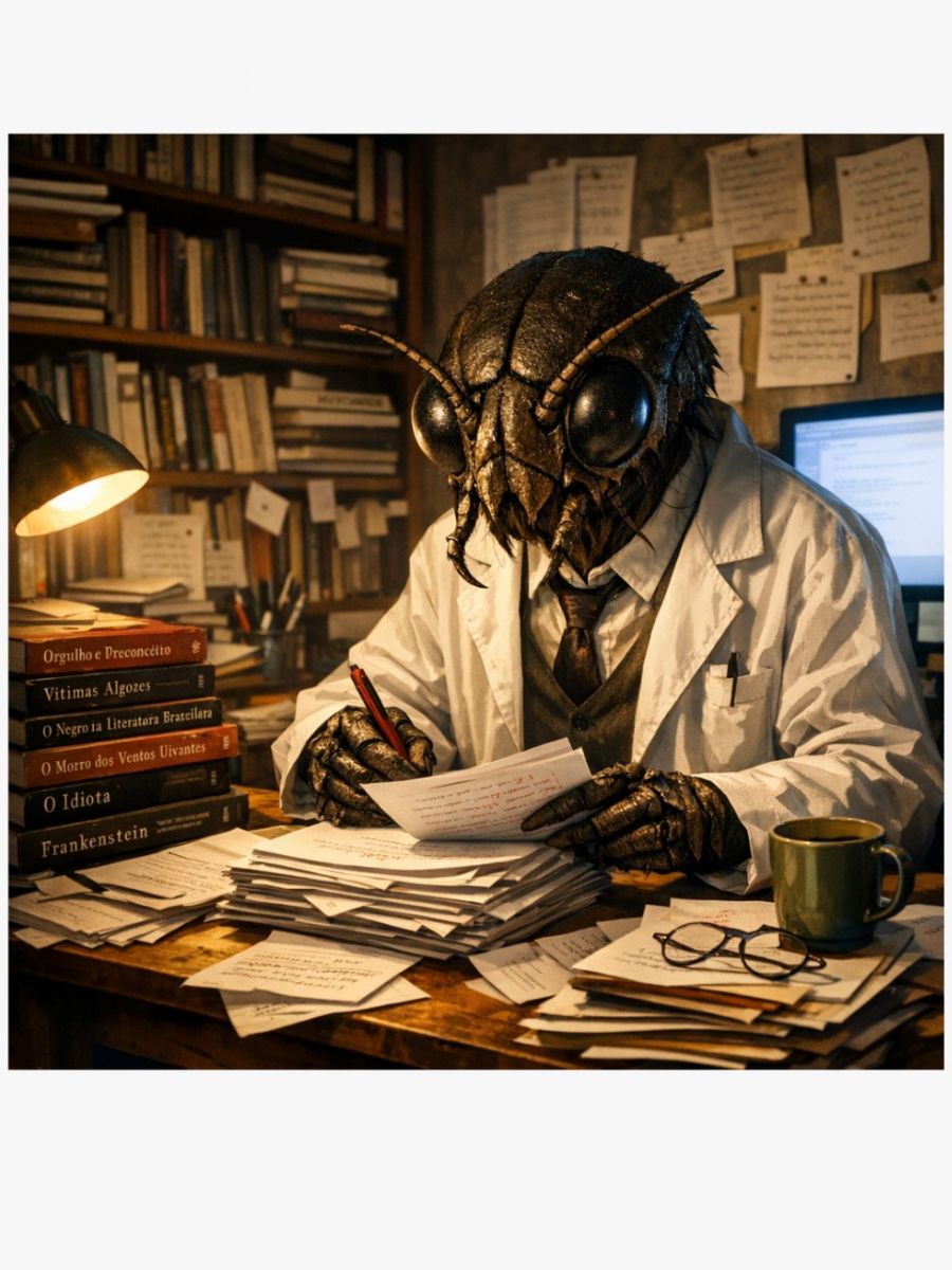 Levanto os olhos e percebo onde estou: no meu escritório. Estou rodeado por livros, cadernos, anotações. Escrevo. Planejo. O monitor do computador acende como um farol discreto em meio ao silêncio. Por alguns segundos, vejo-me metamorfoseado — jaleco imaginário, pilhas de papéis, textos para corrigir.