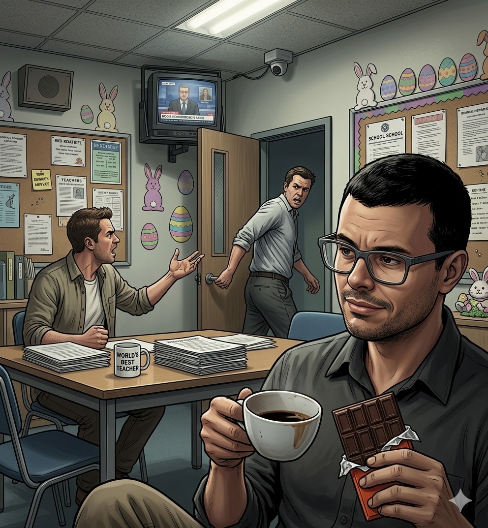 O ambiente, que deveria ser um refúgio de lucidez, assemelha-se mais a uma panela de pressão emocional. O café, sempre requentado, exala um aroma que mistura cansaço e resignação. As cadeiras rangem como se protestassem contra o peso não apenas dos corpos, mas das frustrações acumuladas. Sobre a mesa, pilhas de provas, canecas com frases motivacionais já desgastadas e olhares que alternam entre o vazio e a indignação.