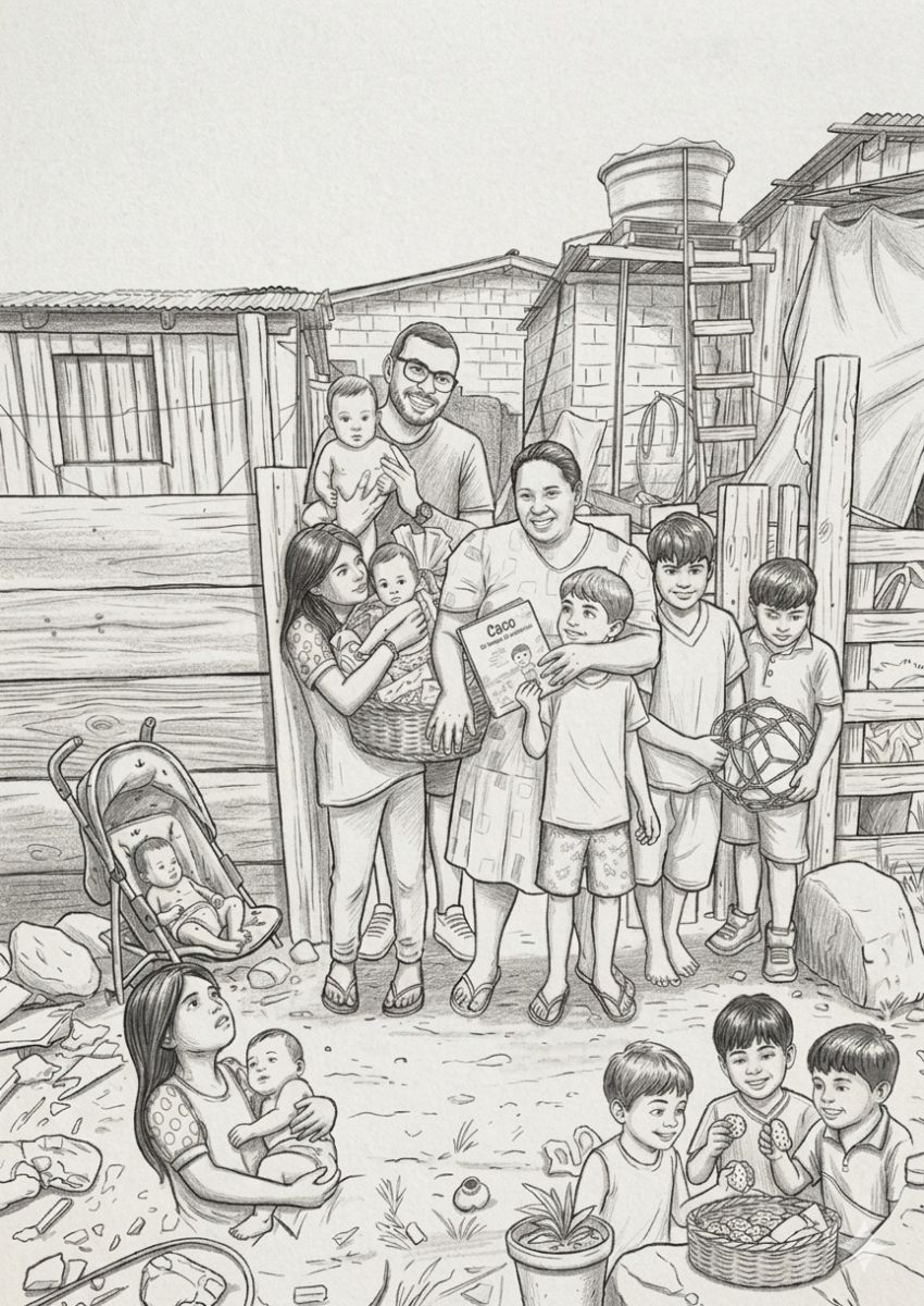 Respiramos fundo, abraçamos as crianças e entregamos a cesta de Páscoa. Antes disso, perguntei se sabiam ler e ofereci um dos meus livros, “Caco em Busca da Felicidade”, para que tivessem acesso a um pouco de boa literatura. A menina de dez anos pegou o livro e começou a ler imediatamente. As crianças sorriam com uma alegria indescritível. Meu filho sentou-se no chão, ao lado de restos de comida, copos plásticos e moscas e brincou com elas como se nada daquilo importasse. E, para as crianças, realmente não importava. Abriram a cesta, comeram bolachas de Páscoa e brincaram enquanto conversávamos com os pais.