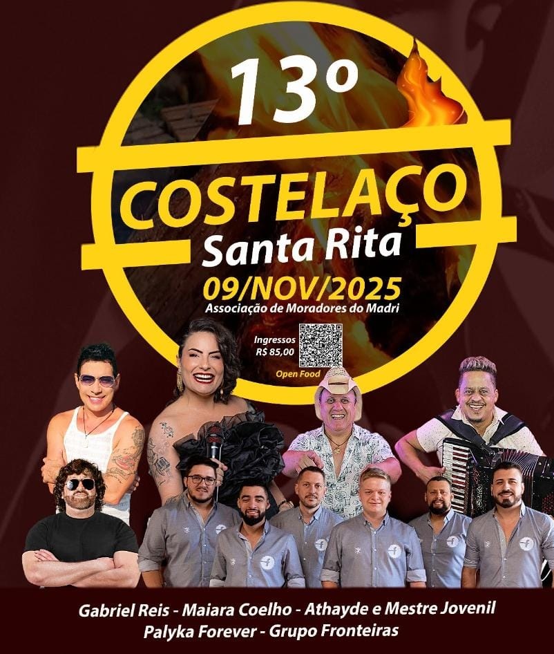 COSTELAÇO DE SANTA RITA. Um dos eventos mais tradicionais de Palhoça está de volta! No domingo (9), acontece a 13ª edição do Costelaço de Santa Rita, reunindo famílias, amigos e muita música boa na Associação de Moradores do Madri. Conhecido pelo clima acolhedor e pela deliciosa costela no fogo de chão, o evento já é parte da história da cidade e promete mais uma edição de sucesso. A programação musical traz: Gabriel Reis, Maiara Coelho, Athayde e Mestre Jovenil, Palyka Forever e o Grupo Fronteiras. Os ingressos custam R$ 85, no formato open food, e já estão disponíveis com os organizadores.