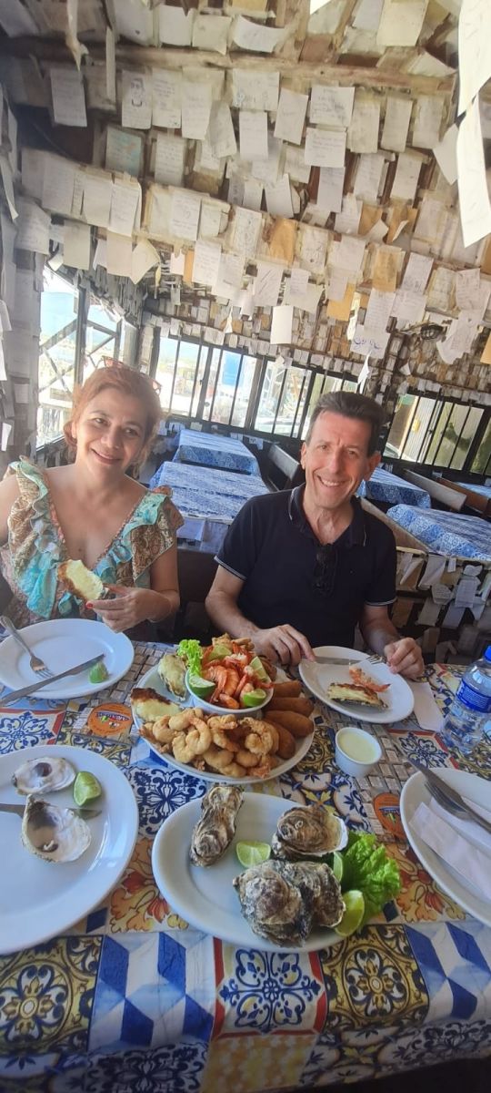 TURISTANDO. O Bar do Arante é um restaurante extremamente tradicional e folclórico, localizado à beira da praia do Pântano do Sul, em Florianópolis. Fundado em 1958 como uma pequena venda para pescadores, o local se tornou um ponto turístico famoso pela sua comida típica manezinha (especializada em frutos do mar frescos) e, principalmente, por uma tradição curiosa: suas paredes e teto são completamente cobertos por milhares de bilhetes deixados por visitantes de todas as partes do mundo. Esses bilhetes, que começaram como recados para amigos na década de 1970, hoje são mensagens, desejos e registros de passagem que transformaram o Bar do Arante em um verdadeiro patrimônio cultural de Santa Catarina. Na foto, a jornalista Marta Lobo, do Jornal Internacional de Turismo, e Fabrizio Battisti, atual diretor do prestigiado Hotel Quirinale, em Roma, na Itália.