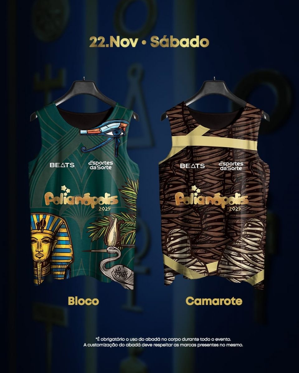 FOLIANÓPOLIS. A 18ª edição do Folianópolis, considerada a micareta mais bonita do Brasil, está prestes a agitar a Passarela Nego Quirido, em Florianópolis. O evento, entre 20 e 22 de novembro, revelou a identidade visual de seus abadás, que segue o tema “Egito”. A entrega dos abadás começa no dia 17, no “Lounge do Folia”, especialmente montado no Floripa Airport, oferecendo uma série de atrações e benefícios exclusivos.