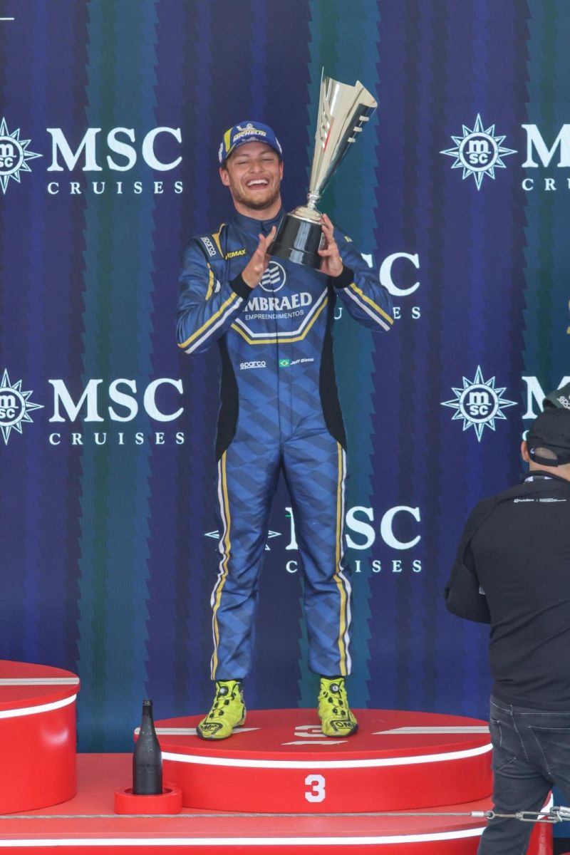 PORSCHE CUP. O piloto catarinense Jeff Giassi garantiu um excelente resultado na Porsche Cup C6 Bank, no domingo (9), ao cruzar a linha de chegada em terceiro lugar na categoria Sprint (Carrera Cup), em Interlagos. A prova integrou a etapa preliminar do Grande Prêmio São Paulo de Fórmula 1, garantindo grande visibilidade. Foi seu 11º pódio em 15 competições da Porsche Cup.