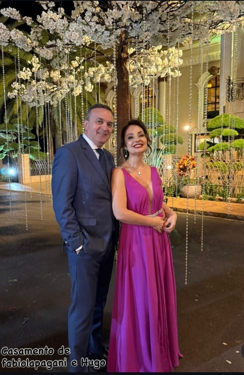 ELEGANTES. O casal Alexandre Pagani e Jane irradiava requinte e charme, impecavelmente vestido em trajes formais, na celebração da união de Fabíola e Hugo, transmitindo seus votos de felicidade e contribuindo com distinção e brilho para o sucesso da festa.