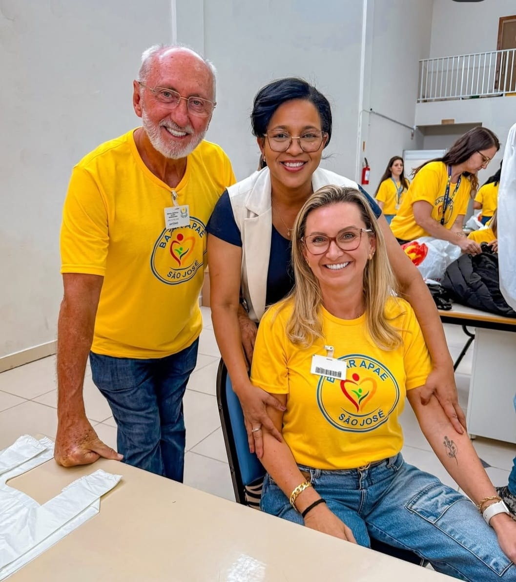 BAZAR EM PROL DA APAE. O bazar de produtos da Receita Federal em prol da Apae de São José, realizado nos dias 14, 15 e 16 de novembro, foi um grande sucesso! A Apae de São José, liderada pela presidente Millene Hillesheim, agradece a todos os clientes, colaboradores e voluntários pela participação. O evento teve um grande fluxo de pessoas que, além de adquirir mercadorias, contribuíram financeiramente para a instituição. O sucesso é atribuído ao engajamento da comunidade e à organização do evento. O trabalho da Apae continua, e o apoio da comunidade é essencial. A foto destaca a união da presidente Millene e seu pai, o ex-presidente e atual diretor social Antônio Hillesheim, com a vereadora de São José Vera Pinheiro.