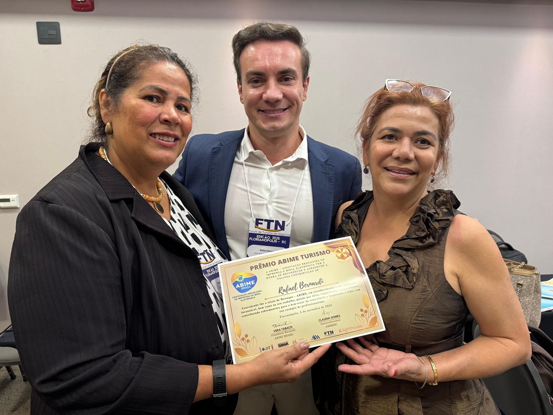 TURISMO DE NEGÓCIOS. O executivo Rafael Bernardi foi um dos grandes destaques do recente Fórum de Turismo de Negócios (FTN), realizado em Santa Catarina. Além de contribuir ativamente com uma palestra durante a programação, Bernardi foi agraciado com o Prêmio Abime Turismo Santa Catarina 2025, cuja solene entrega ocorreu no encerramento do Fórum. A honraria, concedida pela Associação Brasileira de Imprensa de Mídia Eletrônica e Digital (Abime), reconhece sua atuação como uma figura de destaque que impulsiona a inovação e o crescimento do setor de viagens em solo catarinense. Bernardi, que lidera as franquias Flytour e BeFly Travel em Florianópolis e Itajaí, consolidou-se no mercado por sua gestão estratégica e por trazer uma visão disruptiva para o segmento.