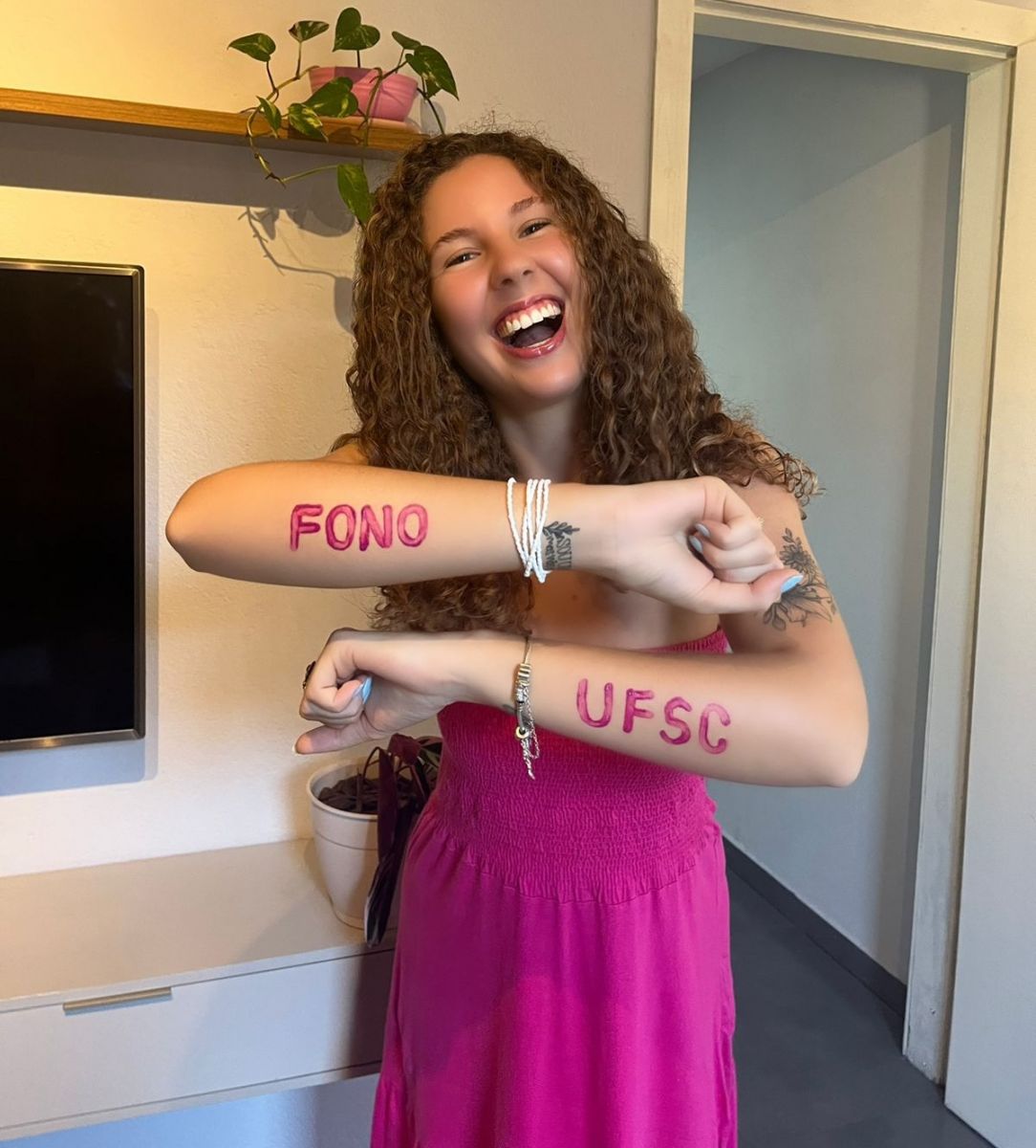 DESTAQUE ACADÊMICO. A jovem palhocense Amabille Martins Weingartner celebra uma fase de grandes conquistas. Após intensa dedicação, ela garantiu sua vaga no curso de Fonoaudiologia da UFSC. Para completar a semana especial, Amabille comemorou seu aniversário com uma bela homenagem à beira-mar, cercada pelo carinho de amigos e familiares.