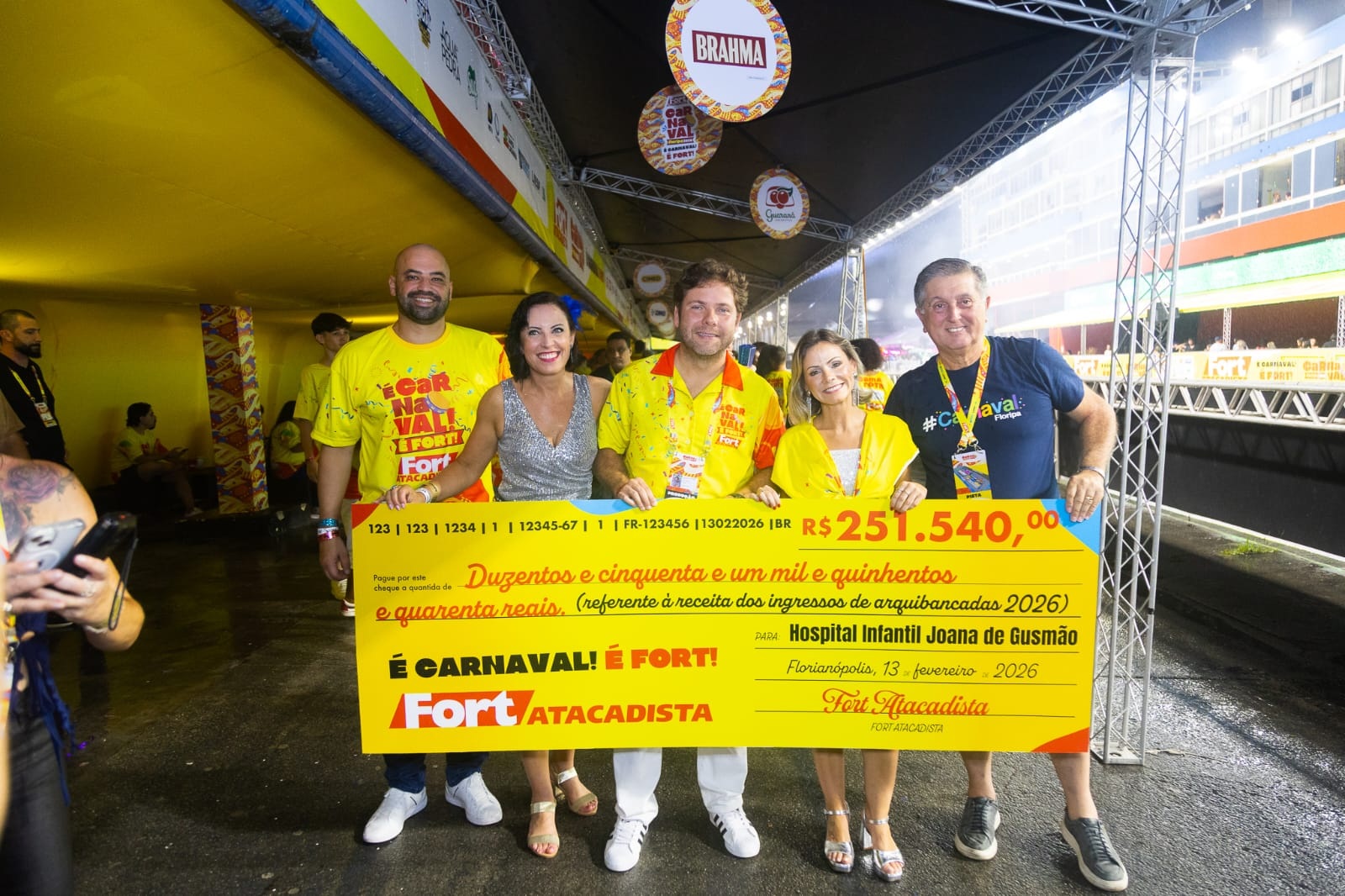 CARNAVAL SOLIDÁRIO. O Fort Atacadista consolidou sua marca no Carnaval de Florianópolis 2026, unindo folia e responsabilidade social. Além de patrocinar as arenas de rua e os desfiles na Passarela Nego Quirido, a rede entregou um cheque de R$ 251.540 para o Hospital Infantil Joana de Gusmão. O valor, fruto da venda de ingressos das arquibancadas, foi destinado à instituição após uma votação popular com 327 mil votos. Segundo a gestora de marketing do grupo, Silvia Marquez, a ação reforça o papel do Fort como agente ativo na cultura e na economia local. Na foto: Diogo Demarchi Silva, Maryanne Mattos, Lucas Pereira (diretor Fort Atacadista), Maristela Biazon (diretora Hospital Infantil) e o prefeito Topazio Neto.