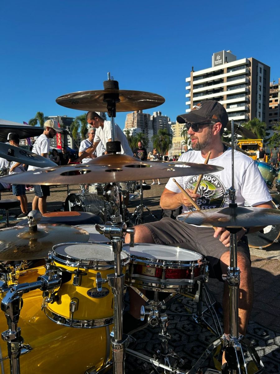 ENCONTRO DE BATERIAS. O dentista Gustavo Lopes foi um dos participantes do Palhoça Drum Fest, realizado no sábado (18), nos lagos da Pedra Branca. Além da dedicação no consultório, ele mostrou talento com as baquetas ao participar da apresentação coletiva de bateristas, que integrou a programação de aniversário de Palhoça. O evento reuniu músicos de diferentes níveis e reforçou o caráter cultural e artístico da celebração.
