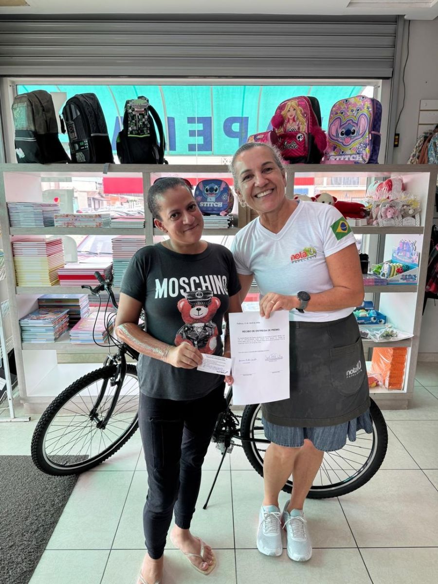 TRADIÇÃO QUE ATRAVESSA GERAÇÕES. A Papelaria Nota 10 realizou mais uma edição da já consagrada campanha de volta às aulas e celebrou, com muita alegria, a entrega do prêmio deste ano. A ganhadora foi Janaína Regina dos Santos, contemplada no sorteio realizado no dia 11 de abril. Ela levou para casa uma mountain bike. A equipe da papelaria fez a entrega.