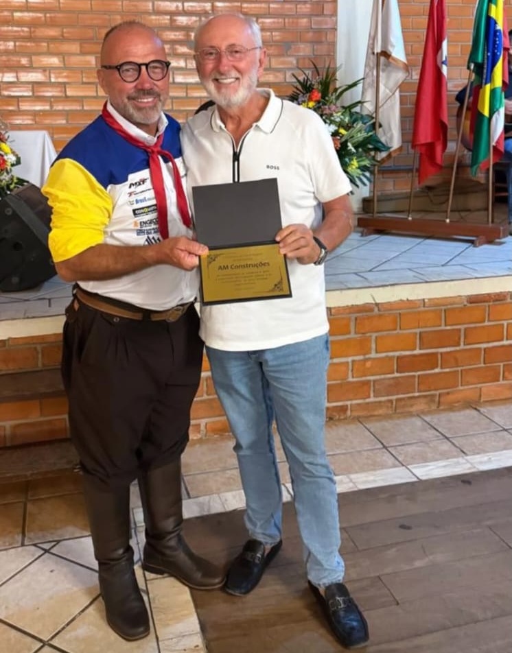 HOMENAGEM. Em um gesto de valorização às parcerias que sustentam as tradições catarinenses, o patrão do CTG Os Praianos, Rudinei João de Souza, entregou uma placa de homenagem à AM Construções, representada por seu presidente, Antônio Hillesheim. O reconhecimento destaca o apoio indispensável da construtora para a viabilização do 53º Rodeio Nacional, que ocorrerá entre 29 de abril e 3 de maio. Para Rudinei, a presença de empresas sólidas como a AM Construções é fundamental para manter a excelência de um dos rodeios mais desejados do Brasil. Antônio Hillesheim, sempre presente nos grandes marcos de São José e região, reforça, com a parceria, o compromisso da AM Construções em fomentar a cultura, o turismo e o desenvolvimento local. A solenidade aconteceu no CTG os Praianos. Parabéns!
