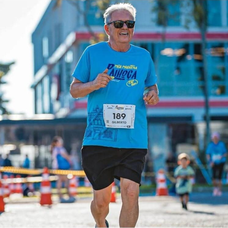 OURO NO PÓDIO. Mesmo já tendo chegado à casa dos 70 anos, Gilberto Rosa mostra que correr é celebrar a vida. Após vencer a categoria dele na Corrida da Ponta do Papagaio, ele segue firme, incentivando todos a praticarem esportes. Parabéns, Giba, por representar tão bem a nossa Palhoça nos 132 anos da cidade!