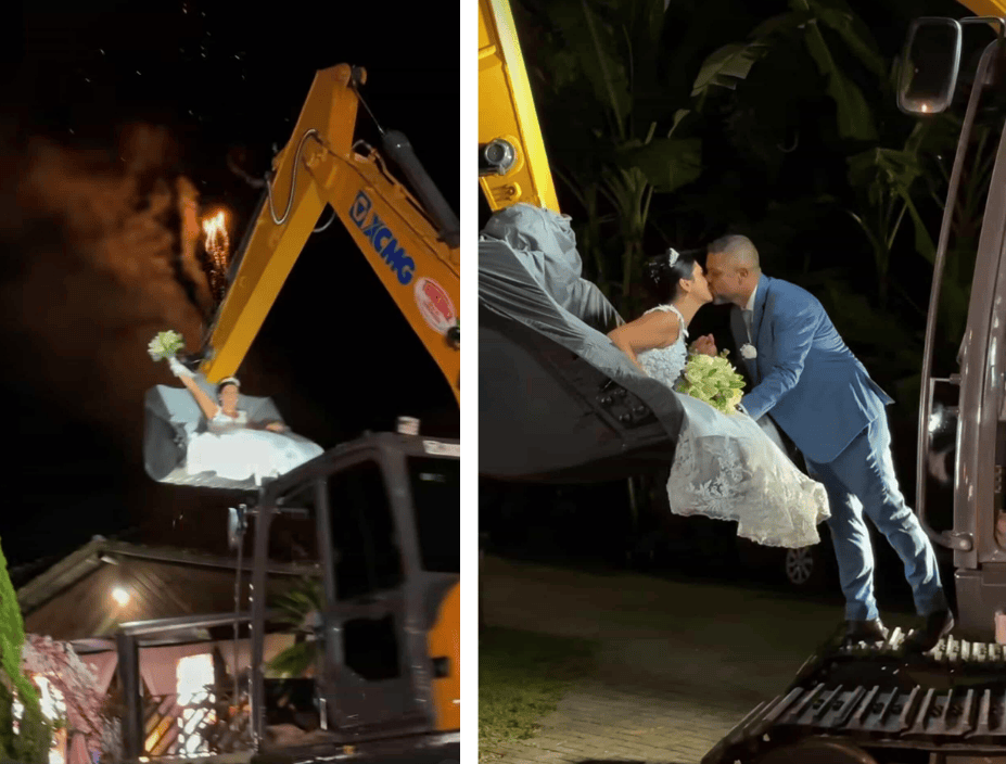 CRIATIVIDADE. Um casamento marcado pela emoção, pela beleza e também por um momento inusitado chamou a atenção no sábado (18). A união de Fernanda Dalila Pereira e Claudir Kunz foi celebrada no Sítio das Figueiras, em Antônio Carlos, reunindo familiares e amigos em uma cerimônia especial. O que surpreendeu os convidados e rendeu registros curiosos dos fotógrafos foi a cena em que o noivo, empresário do setor de terraplanagem, utilizou uma retroescavadeira para suspender a noiva, arrancando aplausos e sorrisos. O casal, que mora no São Sebastião, tem uma história que também começou no ambiente profissional, já que Fernanda foi gerente da empresa de Claudir, a Terkunz Terraplanagem.