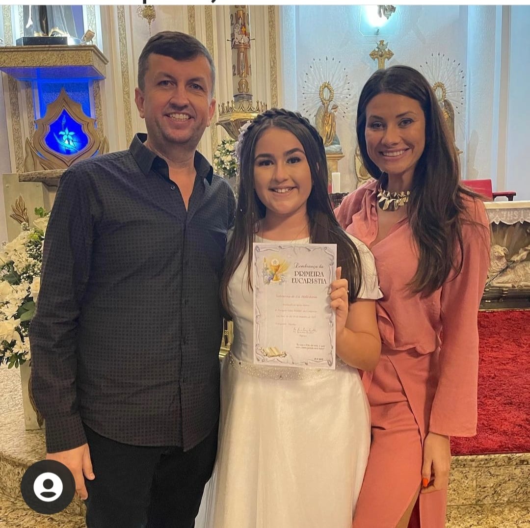 EUCARISTIA. O competente diretor comercial da AM Construções e Incorporações, Douglas Hillesheim, celebra um momento muito especial na vida da sua linda filha, Valentina, que fez a eucaristia, início de uma vida em comunhão com Deus, na igreja de Campinas, dia 16 de outubro. Na foto, ele está ladeado pela filha e pela esposa, Cinthia Heinzen.