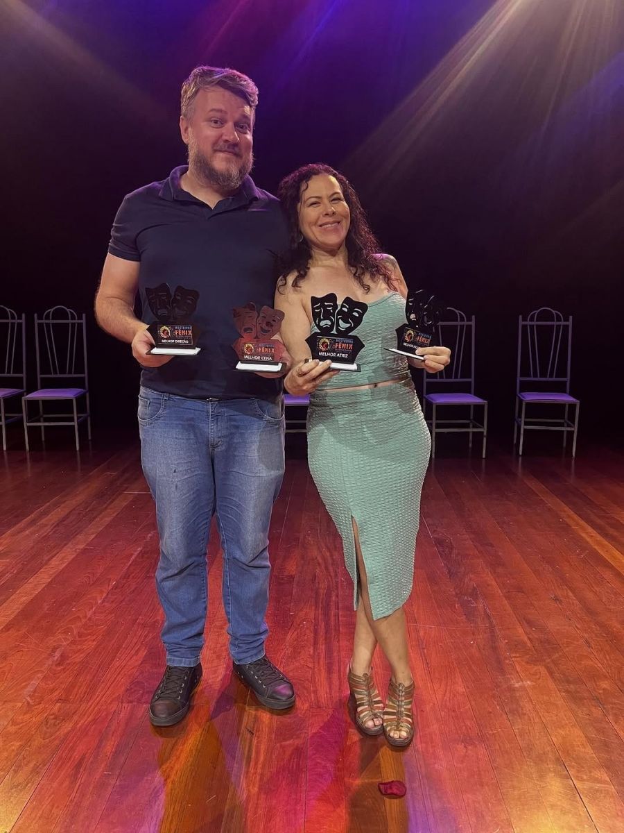 O ator e diretor palhocense Welington Moraes esteve entre os premiados da 1ª Mostrinha de Cenas Curtas de Tupã, realizada pelo Instituto Luiz Bertazzoni. Junto da companhia KazaBaka Cia de Teatro, ele conquistou troféus por uma cena adaptada de seu novo espetáculo, “Nossa Senhora do Desterro”, que tem texto e direção assinados por ele. A premiação ocorreu na última sexta-feira (17), durante o festival anexo à VII Mostra Fênix de Linguagens Cênicas, em Tupã (SP). A montagem levou os troféus de Melhor Cena, Melhor Direção (para Welington Moraes), Melhor Atriz (Celma Ioci) e Melhor Figurino, além de conquistar duas indicações adicionais, nas categorias Melhor Ator (Guilherme Macedo) e Melhor Atriz Coadjuvante (Lissa Campos).