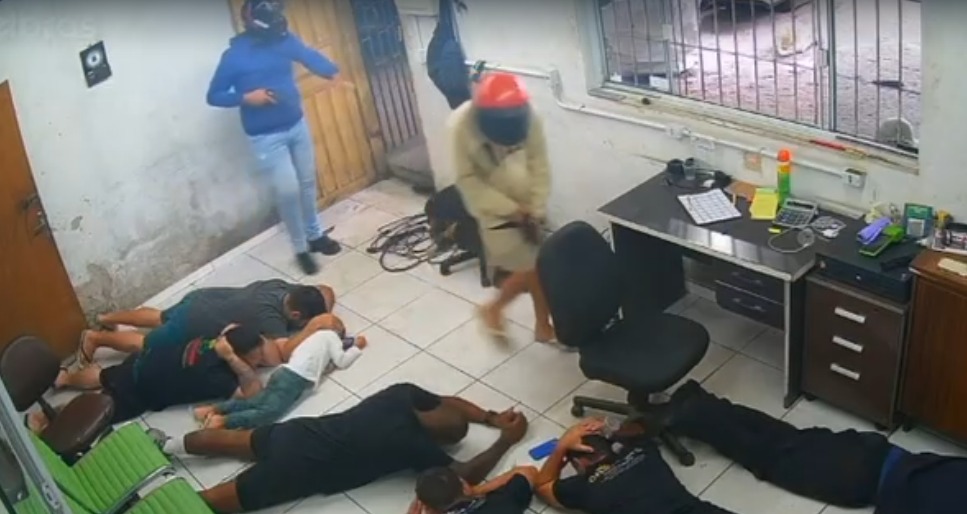 Uma empresa de reciclagem localizada no Passa Vinte foi assaltada na manhã desta terça-feira (3). Imagens das câmeras de segurança do local mostram funcionários rendidos por criminosos armados.