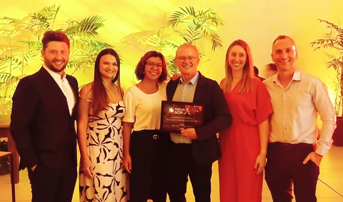 As presenças marcantes do empresário Eni e sua esposa, Leonir, proprietários das Lojas Tudo 10, de Palhoça e Florianópolis; com o filho Jean e a esposa, Auriene; e a filha Aline com o esposo, Samir, durante a entrega do Prêmio Acip, na quinta-feira (16), no Firenze Centro de Eventos, em Palhoça, premiação em que a empresa da família foi destaque.