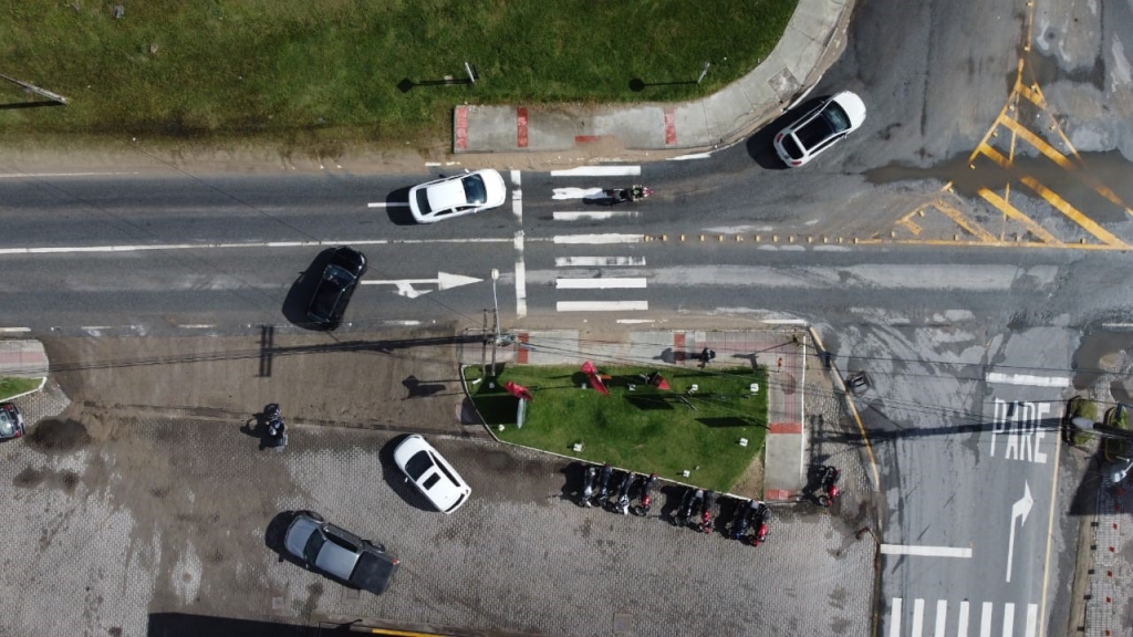 Essa situação ocorre porque os carros e motos que vêm justamente da rua Edeling Schutz não podem mais atravessar pela marginal da BR-101 em direção ao viaduto que se encontra logo adiante.